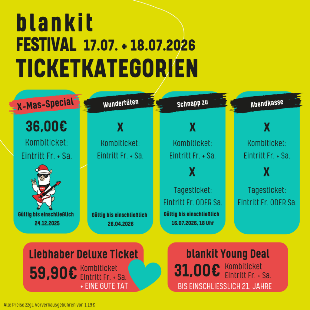 Kinder und Jugendliche bis einschließlich 12 Jahre erhalten kostenlosen Eintritt. Weiterhin dürfen Inhaber*innen eines Schwerbehindertenausweises kostenlos eine Begleitperson mit reinnehmen. Vorraussetzung ist die Markierung „B“ auf dem Schwerbehindertenausweis. Bitte bringt ein Beispielbild mit. Die Begleitperson kommt kostenfrei rein, sofern die Inhaber*innen ein Ticket gekauft haben. Tages- und Kombitickets gelten nicht für den Campingbereich. Hierfür gibt es separate Campingtickets im Online-Ticketshop.